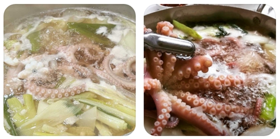 여기에 산지에서 직송된 싱싱한 산낙지가 투입되는 순간, 요리는 정점을 향해 치닫습니다. 뜨거운 육수 안에서 꿈틀거리는 낙지의 생명력은 보는 이로 하여금 경이로움을 자아내며, 살짝 익혀낸 낙지 다리의 식감은 솜사탕처럼 부드러우면서도 쫄깃한 탄력을 동시에 지니고 있습니다. 오래 끓이면 질겨질 수 있는 낙지의 특성을 고려해, 적절한 타이밍에 건져 올려 고추냉이를 푼 간장이나 초고추장에 살짝 찍어 먹으면, 낙지의 담백한 육즙과 박 속의 달콤함이 입안에서 오케스트라처럼 어우러집니다.