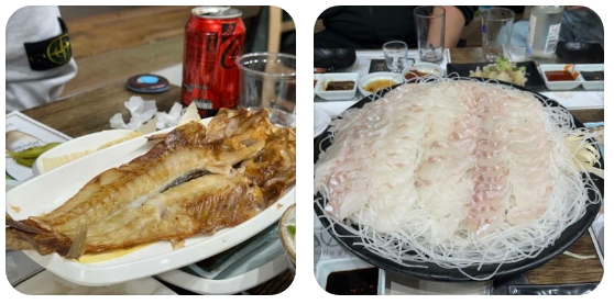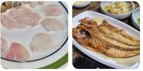 코스의 주인공인 다금바리 회는 그 투명함이 마치 수정과도 같아 접시의 바닥이 비칠 정도입니다. 적당한 두께로 썰어낸 회 한 점을 입에 넣으면 처음에는 단단한 식감이 느껴지다가, 이내 혀끝에서 녹아내리며 특유의 은은한 단맛과 고소함이 밀려옵니다. 전현무는 "이것이 바로 제주의 진정한 맛"이라며 극찬했고, 표예진 또한 화려한 양념 없이도 입안 가득 퍼지는 풍미에 매료된 모습을 보였습니다.