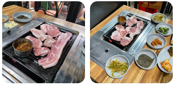 가브리살 또한 이곳의 빼놓을 수 없는 핵심 메뉴로, 등심 덧살 특유의 부드러우면서도 쫄깃한 식감이 일품입니다. 짙은 선홍빛 육색이 증명하듯 단백질의 감칠맛이 응축되어 있어, 첫 점은 아무런 양념 없이 고기 본연의 맛을 즐기는 것이 정석입니다. 방송 중 두 출연진은 고기의 결이 살아있는 비주얼에 압도되었으며, 숯불의 향이 고기 속 깊숙이 배어들어 완성되는 제주 돼지 특수부위의 진수를 생생하게 전달하며 시청자들의 입맛을 자극했습니다.